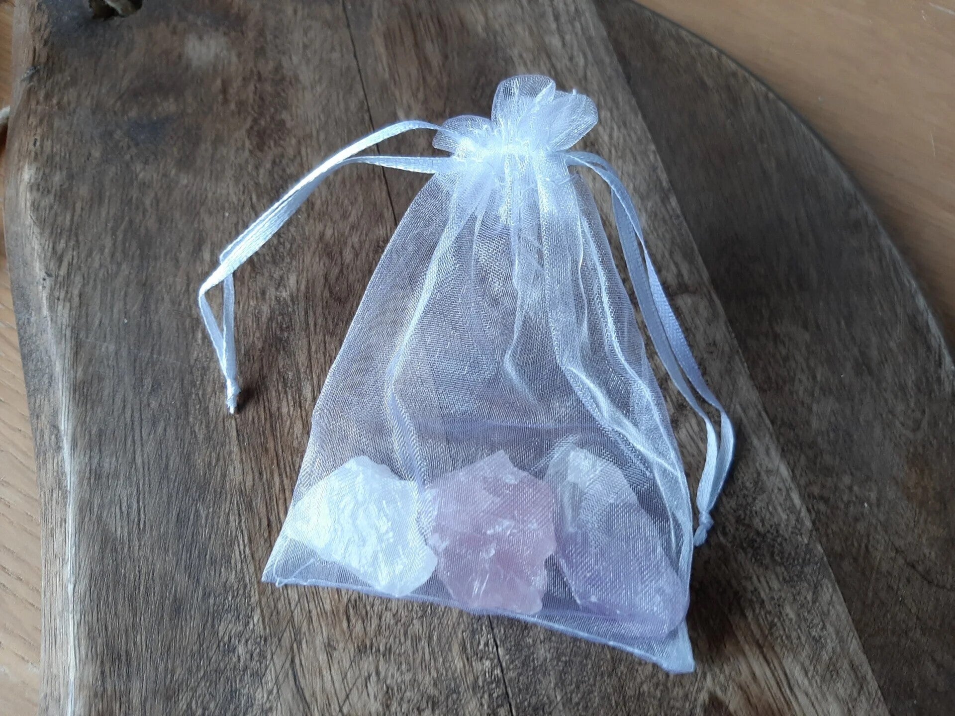 Organza Buideltje met daarin de gouden driehoek, ook wel 'heilige drie-eenheid' genoemd, bestaande uit ruwe Amethist, ruwe Bergkristal en ruwe Roze kwarts.