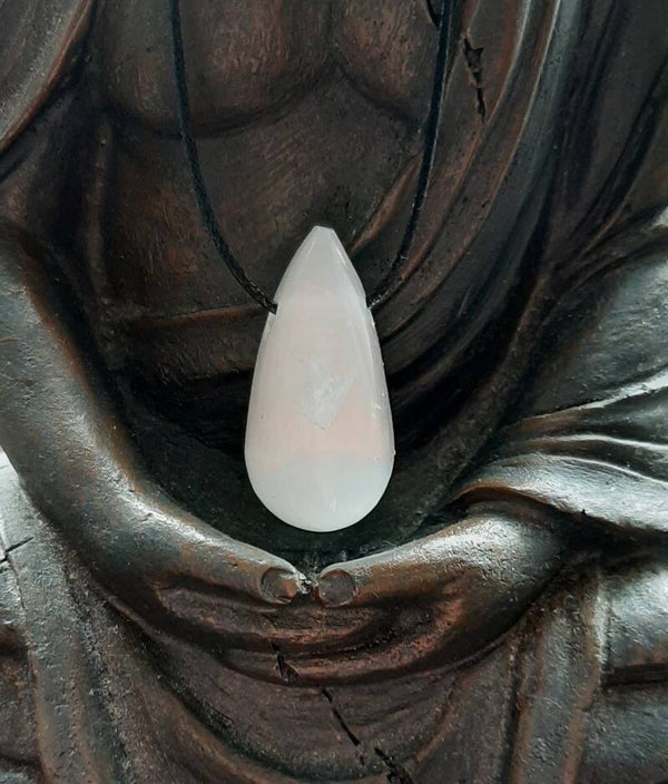Doorboorde Seleniet hanger uit Marokko van ca. 3 cm lang.