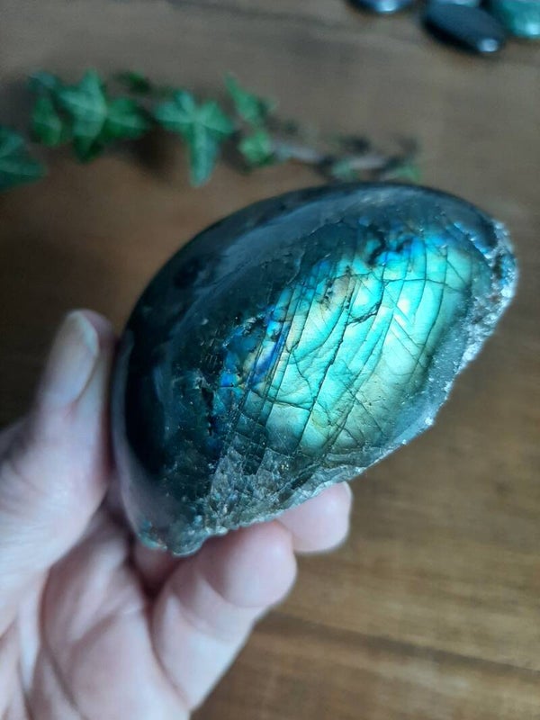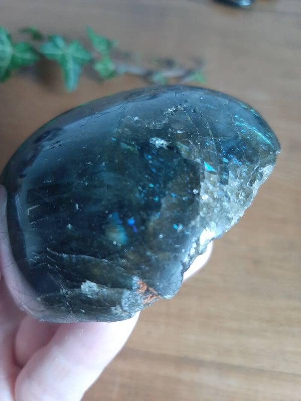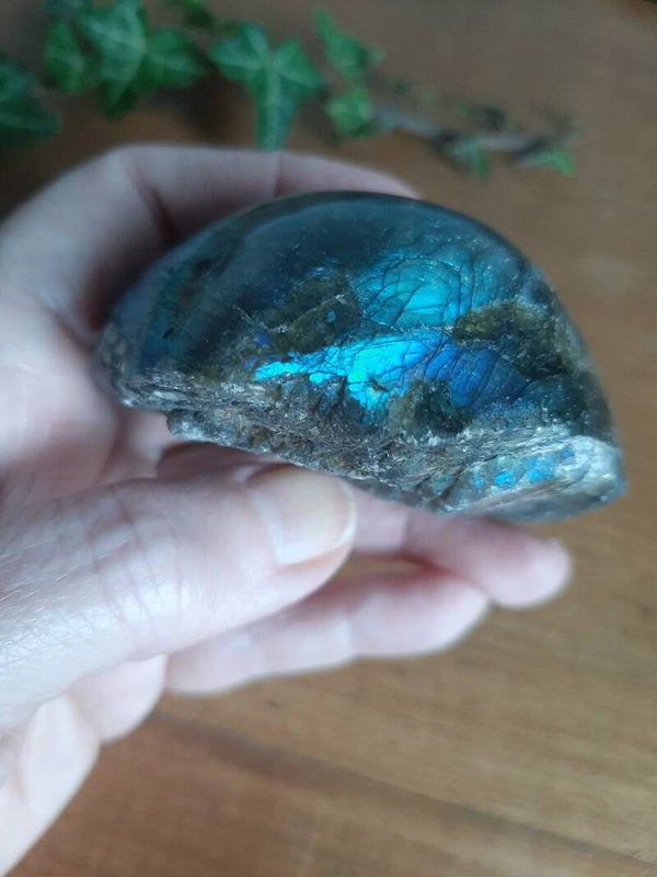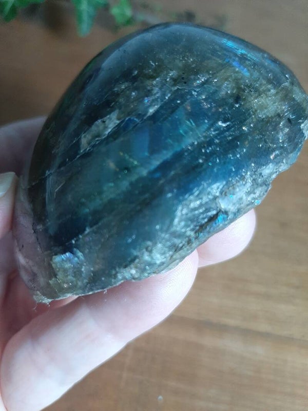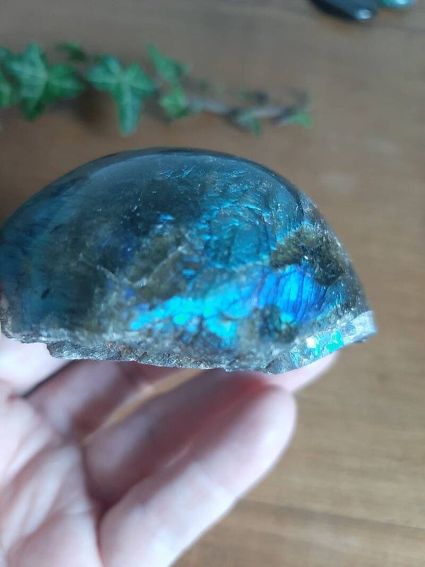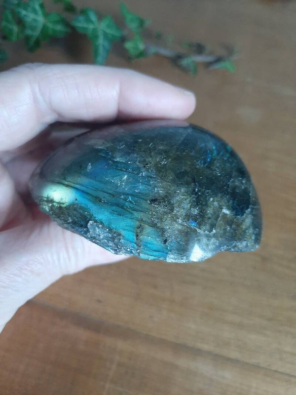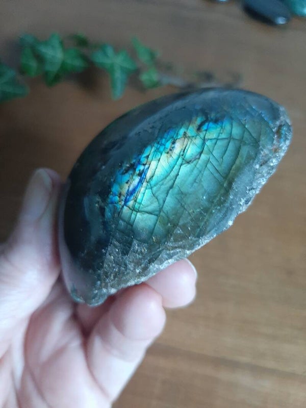 Half gepolijste, half ruwe Labradoriet van 256 gram. Afmetingen ca. 8 x 7.5 x3 cm.