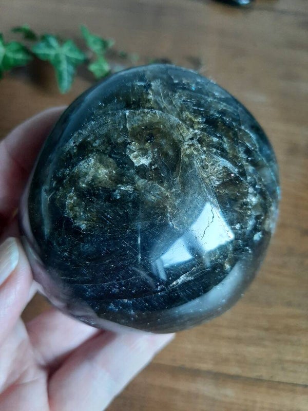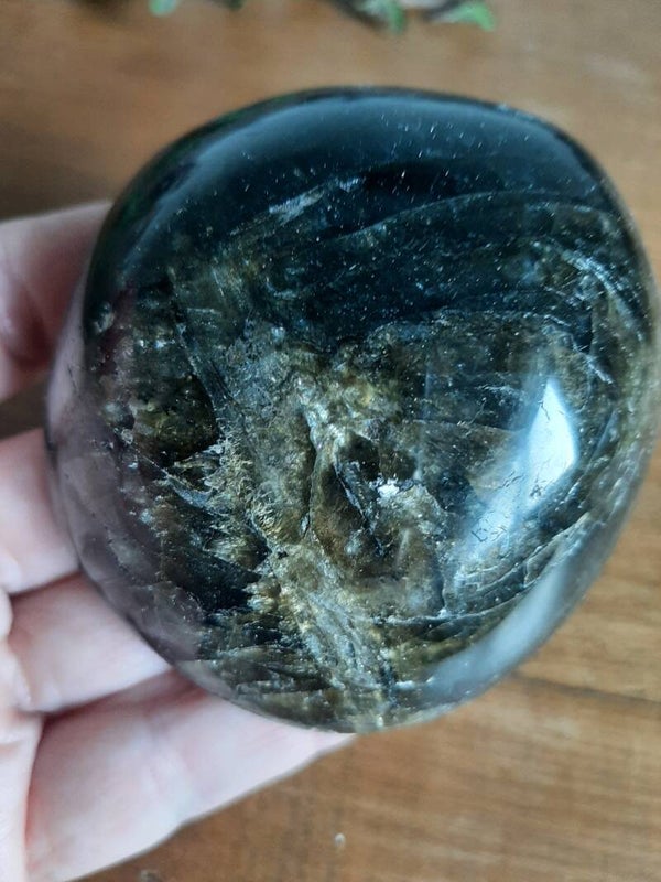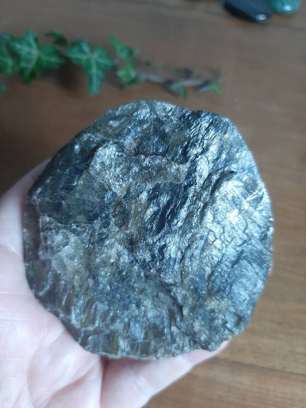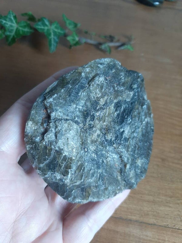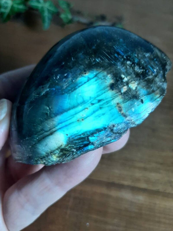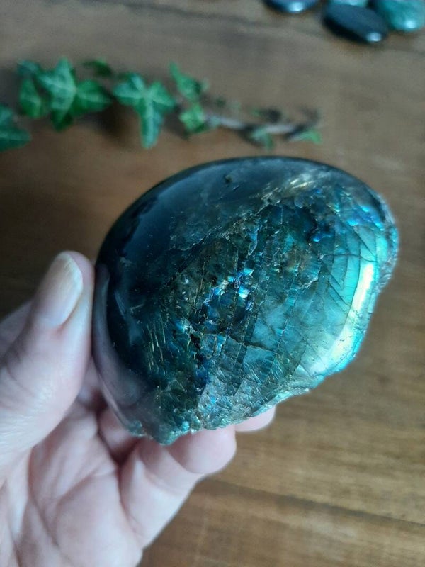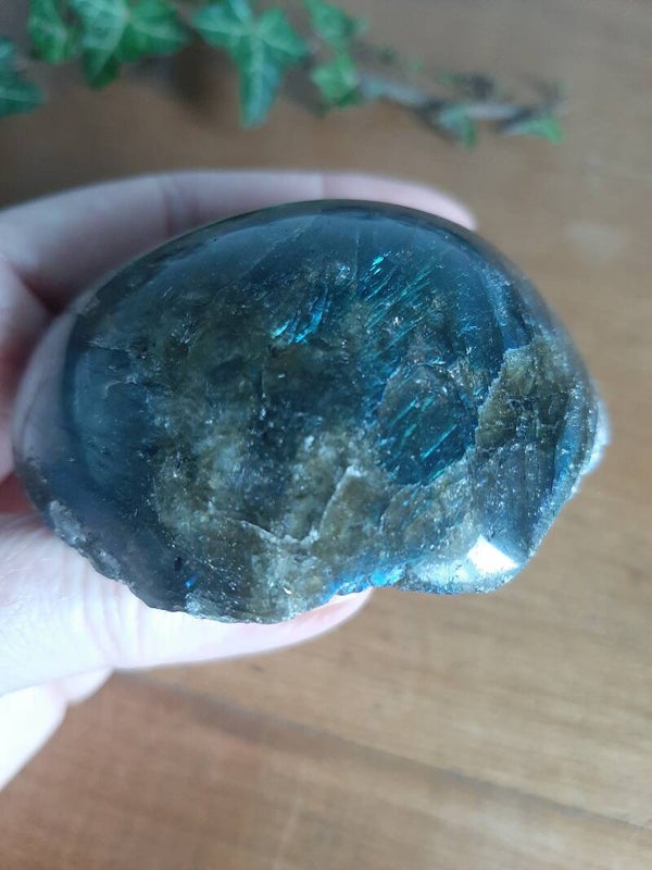 Half gepolijste, half ruwe Labradoriet van 256 gram. Afmetingen ca. 8 x 7.5 x3 cm.